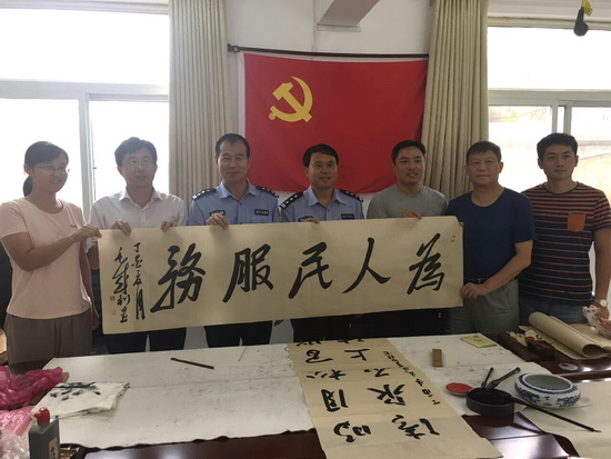 本站讯 为进一步加强警、校合作交流,增进双方友谊,巩固警民共建成效。7月27日下午,365官网保卫处负责人、校书法协会骨干成员前往开封市公安局柳圆口分局开展警民共建慰问活动。