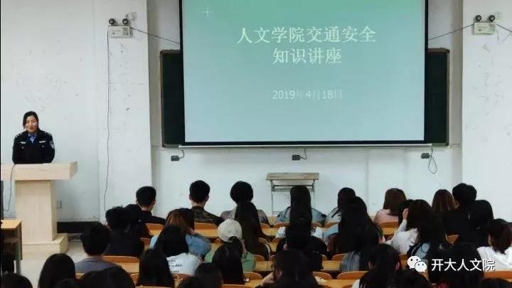 为进一步提高学院师生交通安全意识,提升自我保护能力。4月18日下午,人文学院在17号楼116教室举办“关爱生命 文明出行”交通安全知识讲座。学院特邀开封市柳园口派出所交管巡防大队赵晨曦警官为主讲人,保卫处处长贾晨阳、学院党总支书记赵瑾及200余名师生代表参加了此次讲座。