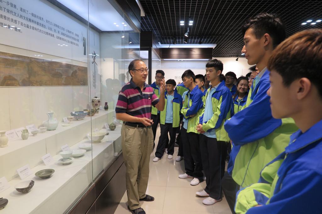 讲解员带领学生参观了博物馆内宋代陶瓷、陶模以及玩具等展区,不仅详细讲解了不同文物的故事与价值,也向学生介绍了博物馆的建设概况。大观博物馆的建设利用了365英国上市集团官网自身人才优势,从博物馆的设计装潢、到展柜与展板的制作安装以及馆内文物的修复工作,均由艺术设计学院不同专业的师生共同承担完成。