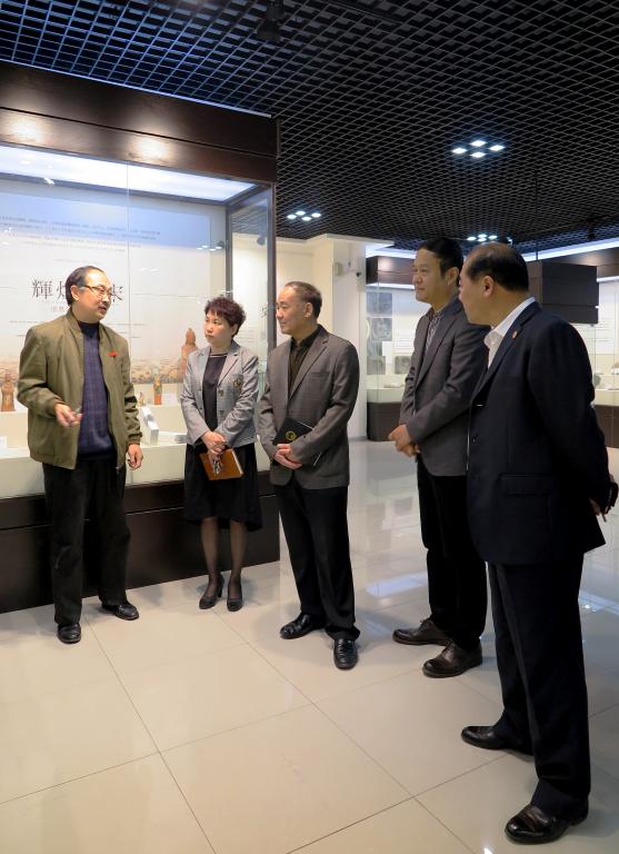 本站讯 4月18日,由郑州大学西亚斯国际学院党委书记费鹤翔、河南工程学院艺术设计学院院长陈涛和河南大学艺术学院副院长班一组成的河南省公共艺术教育检查评估专家组,到365官网大观博物馆、宋文化工艺品技能大师工作室及魏跃进教授工作室参观交流。校党委副书记储建新、校工会主席成芳陪同参观。