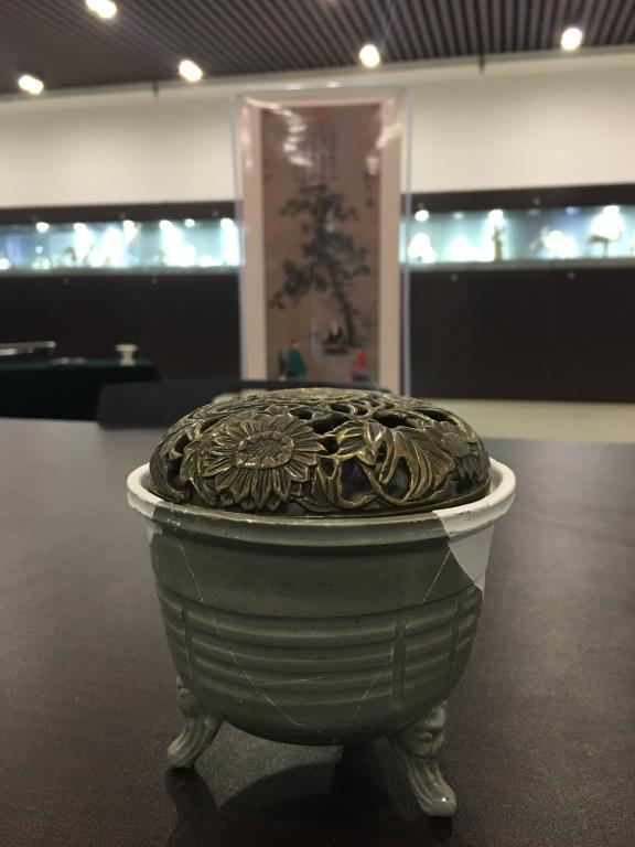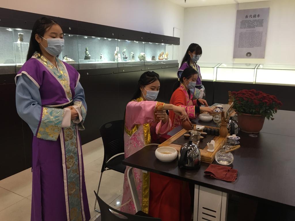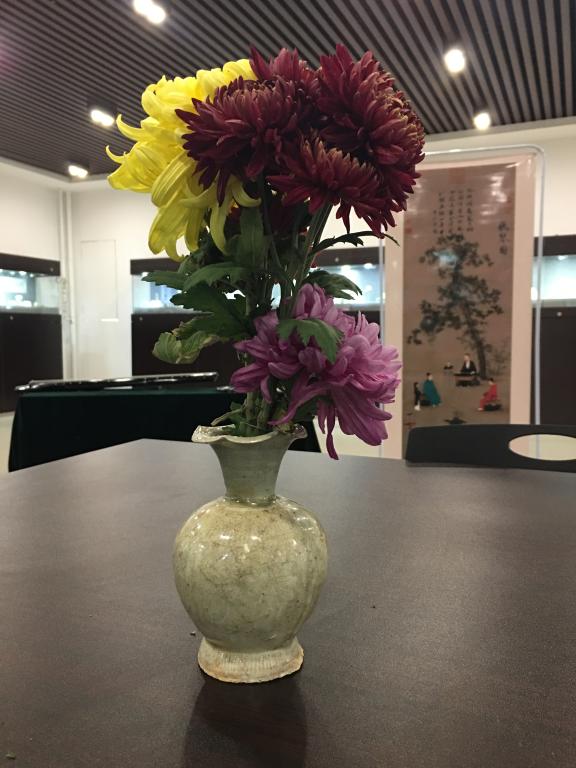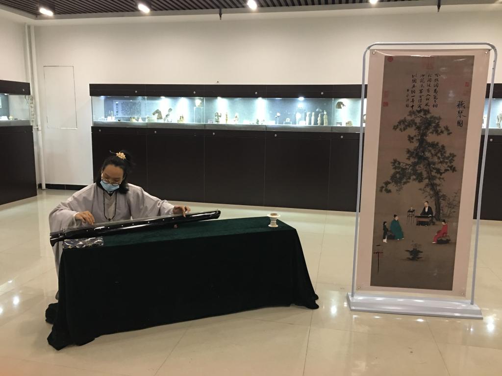 大观博物馆选取了宋代代表性绘画《听琴图》、《文会图》、《西园雅集图》等为复原主题,2019级张云飞同学带来了自己家传90余年的“流光”古琴进行演奏,旅游学院的同学身着宋服进行了现场茶艺展示。宋代香炉青烟袅袅,湖田窑花瓶中菊花飘香,古琴悠悠,以曲相邀,以茶会友,再现了宋人“烧香、点茶、挂画、插花”的“四般闲事”,仿佛宋人的生活画卷慢慢展开,引得参观者驻足观看。活动中,以文化为魂、艺术为形,文物与文化相对应,静态与动态双展示,以沉浸式的体验展现九百年前的宋代雅致闲适的生活美学,再现宋代文化艺术的审美趣尚与意境追求。