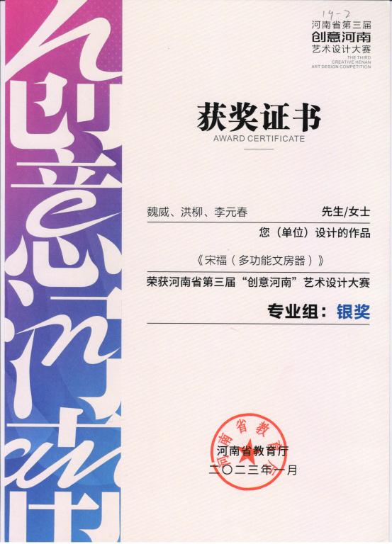 宋福(多功能文房器)》在河南省第三届“创意河南”艺术设计大赛获银奖,提升了大观博物馆优秀传统文化传承与创新育人平台的社会服务能力与影响力。