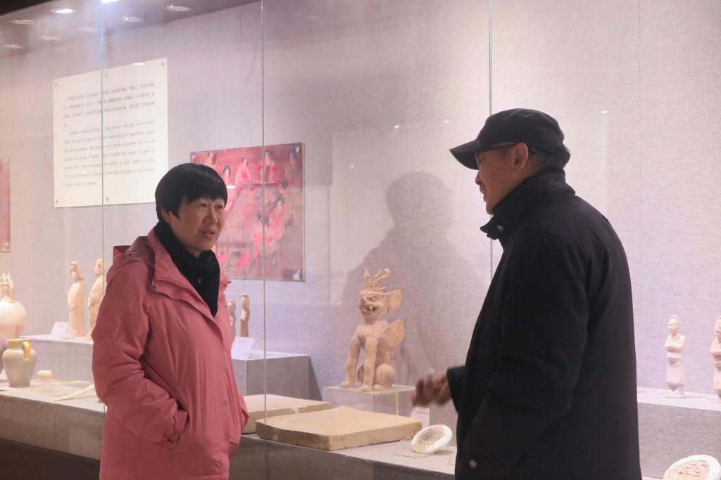 本站讯 12月26日,开封市社会科学界联合会副主席朱虹到大观博物馆进行调研考察。魏跃进教授向朱虹副主席详细汇报了大观博物馆如何利用河南省非物质文化遗产研究基地、河南省社科普及基地以及省示范性劳模和工匠人才创新工作室等文化传承与创新育人平台,以高校文化高地建设为基础,深入挖掘和利用宋代文化资源,紧密围绕开封的文旅文创融合发展所开展的一系列工作,并介绍了大观博物馆2024年的发展规划。