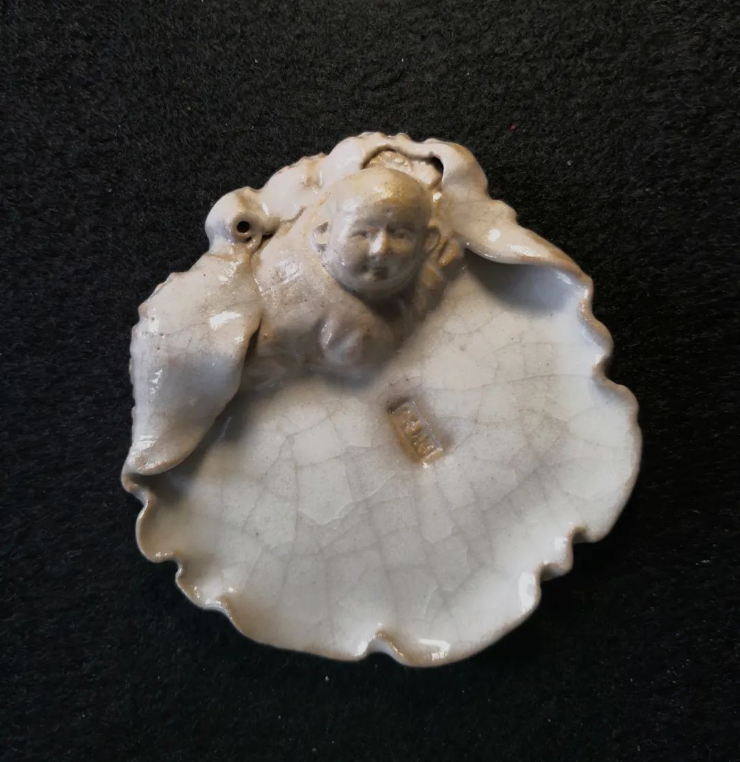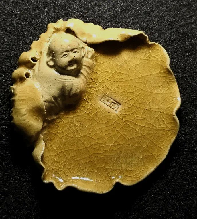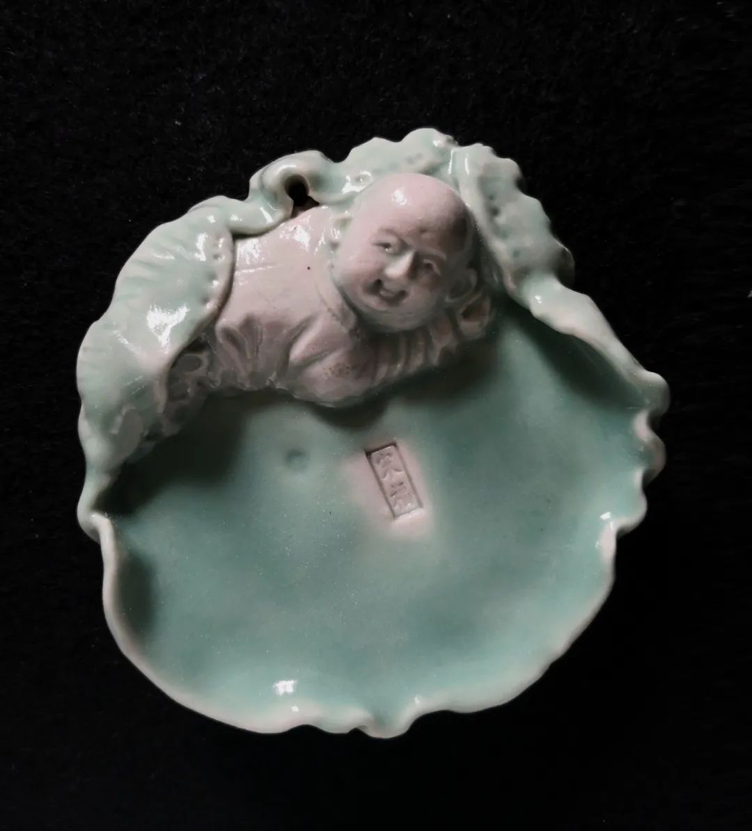 魏教授的这一批作品,名为笔舔,实则可以舔笔、香插和镇纸三用。作品长宽约十余厘米,周边以荷叶卷曲,形成一片“内海”,并塑男童子、女童子、金鱼于其上。童子虽有男女之别,但形貌各异,他们或笑,或嗔,或静,或动,或憨,或巧,件件俱有不同。
