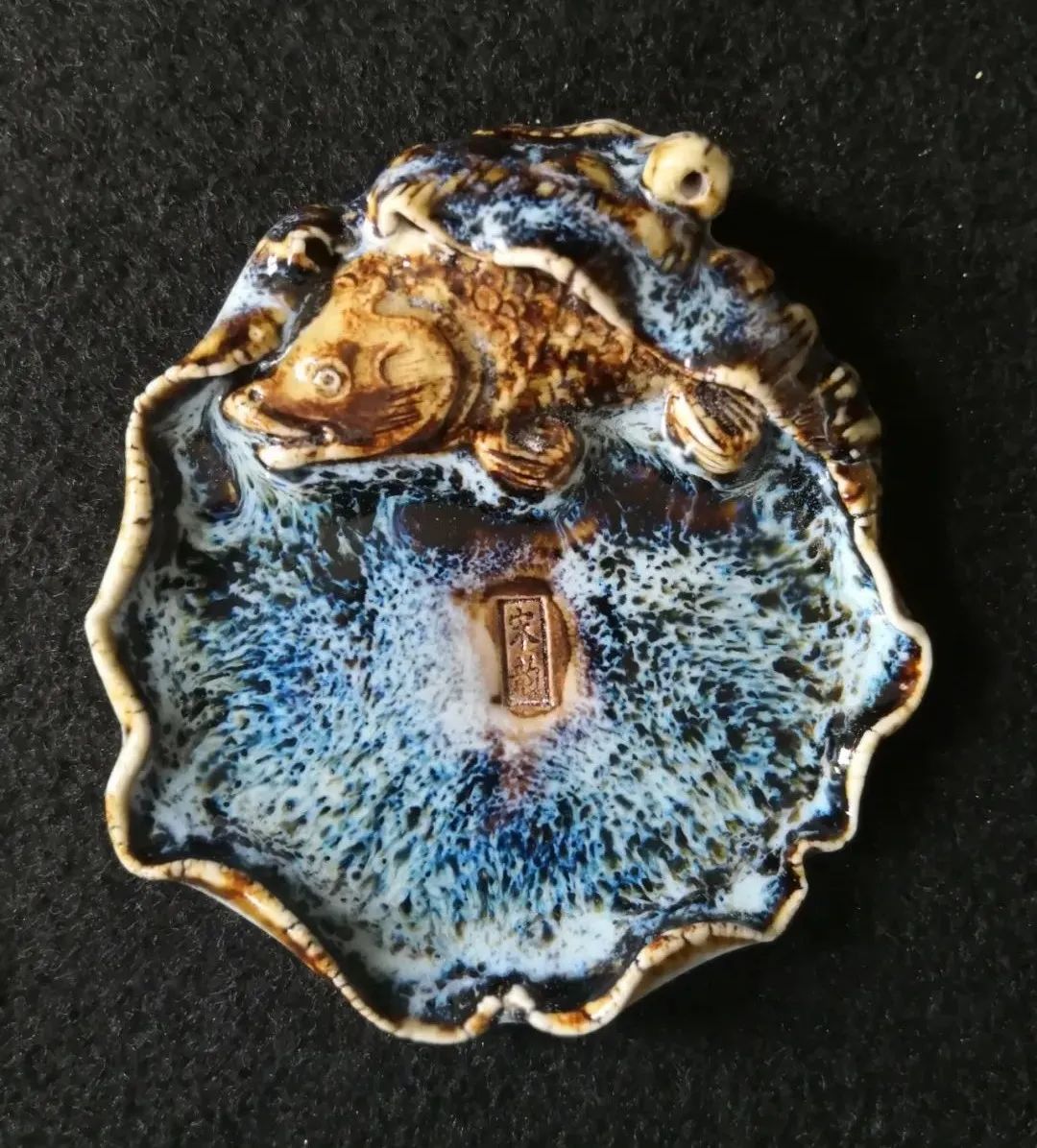 知名宋代陶模收藏家魏跃进教授,追慕宋人美学,以文房雅趣为旨,创制出来一批文房小品,其中就有一批笔舔手作。魏教授这一批作品,样式多变,大体是以荷叶为基础造型,其中还雕嵌有童子、鱼、荷花等。