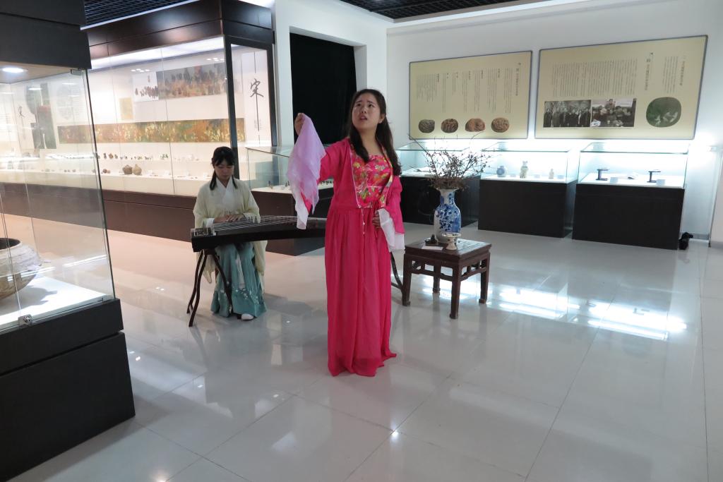 本次活动共有古代文物欣赏、品茗、古筝弹奏、宋词朗诵、书法展示五个部分。