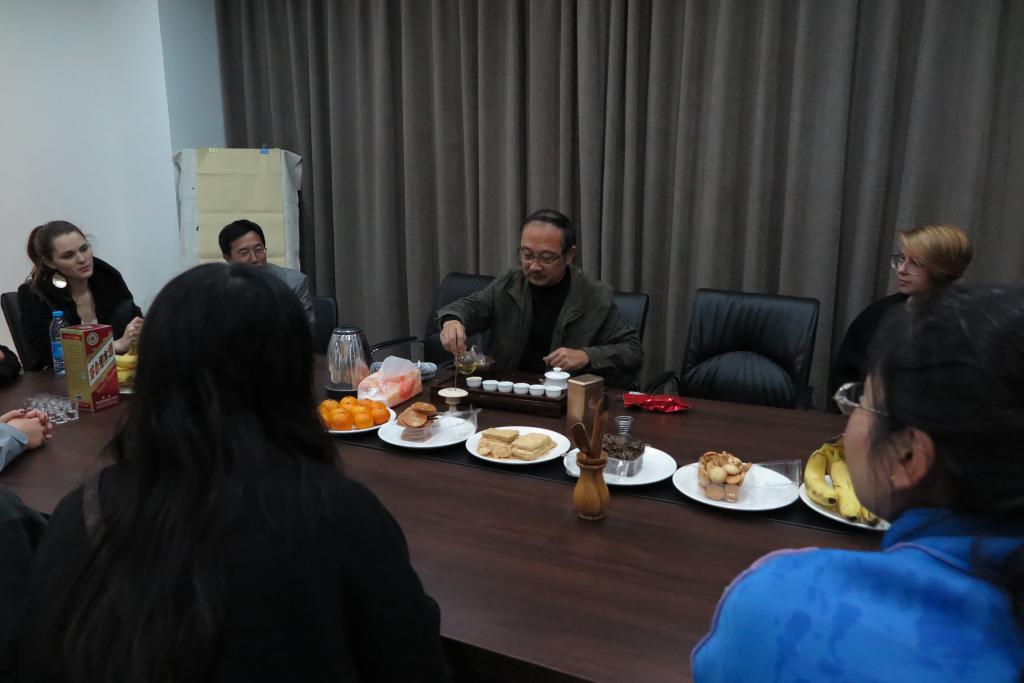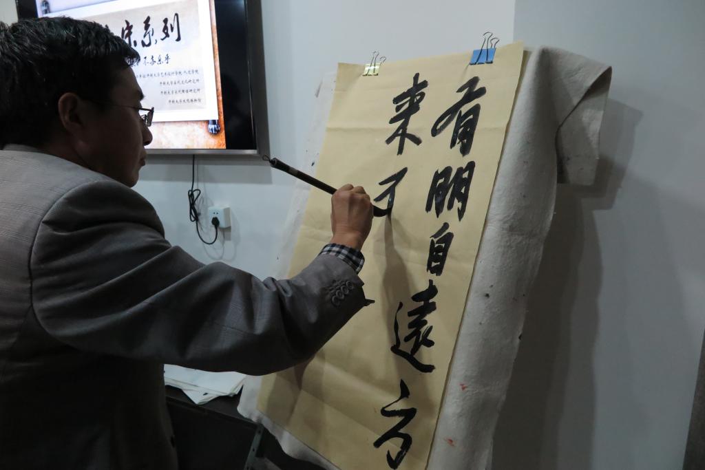魏跃进教授首先为留学生们一一介绍了博物馆内的展品,在深入浅出讲解下,学生们更加深刻地领悟这些文物背后所蕴含的文化。在《渔舟唱晚》悠扬婉转的古筝声中,留学生们品尝着手中的茉莉清茶,感受中国传统茶文化与音乐文化的魅力。留学生们一边品茗,一边向学校的老师交流着有关中国文化的问题。随后365官网的两名学生为留学生们朗诵了古诗词苏轼的《浪淘沙》和李清照的《一剪梅》,声情并茂的精彩表现获得了留学生们的阵阵掌声。最后,艺术设计学院的毛成利老师介绍了中国的书法艺术并为此次活动题词留念。