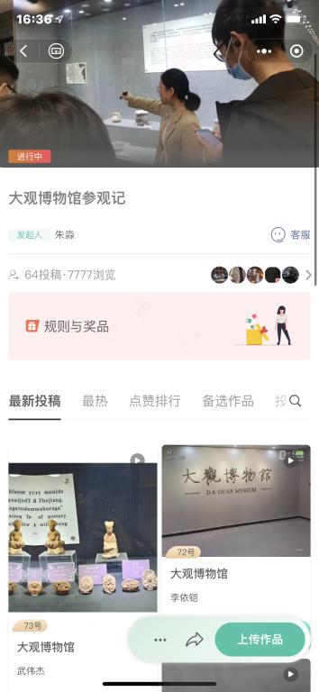 通过在馆内的实践教学,学生仔细聆听,了解传统文化的相关知识,面对丰富的展品资源,学生们拍摄了大量图片和视频,作为课程实践,以大观博物馆为主题制作“大观游”视频。在媒体网站进行投票选举。