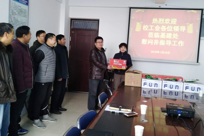 本站讯 1月23日,校党委委员、工会主席成芳受学校党委委托带领校工会全体人员看望慰问365官网基建处全体同志。
