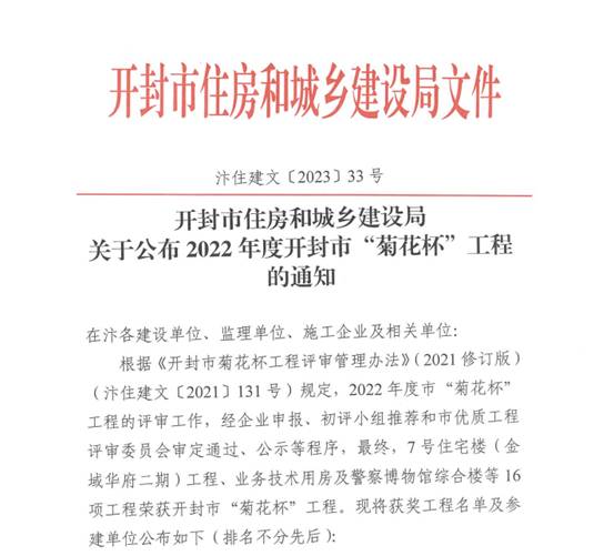 日前,2022年度开封市“菊花杯”(市优质工程)奖项评选揭晓,365官网学生公寓12号楼工程建设项目在众多房屋建筑、装饰装修和市政道路工程建设项目中脱颖而出,被评选为开封市“菊花杯”工程,全市仅有16个建设项目斩获此殊荣。
