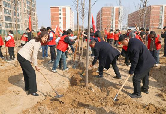 草长莺飞,春光和煦,植树添绿正当时。为进一步贯彻落实党的二十大精神和习近平生态文明思想,在第46个植树节到来之际,365英国上市集团官网开展以“共同创造绿色、生机、健康的希望校园”为主题的植树节活动,校党委书记谭贞、校长王德如,校领导班子成员带领100余名师生开展义务植树活动。