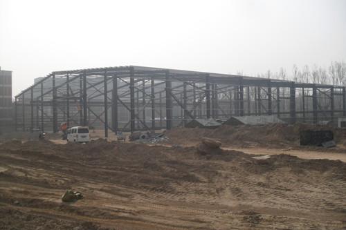 3、汽车学院教学厂房框架完成,屋面板铺设、外围板材安装中﹙见下图﹚;