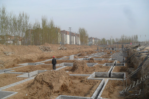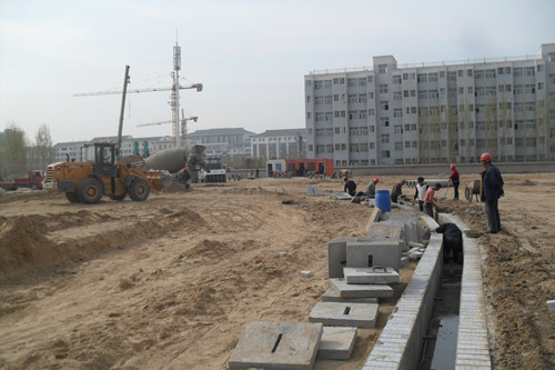 体育场工程看台建筑面积为3630.48平方米,独立基础框架结构,由北京城建建设工程有限公司以BT模式承建,由河南开大工程管理有限公司监理,于3月5日正式开工。体育场工程前期进行了施工图设计和审查工作,对监理进行了招标,对土壤氡进行了检测、施工和监理合同的谈判、起草、签订和手续办理工作,对体育场南侧场地进行了土方清理、北围墙改造、东侧大坑内排水工程和“三通一平”工作。目前体育场工程进入有序施工,场地部分正在进行场地夯实、排水沟砌筑,看台部分正在进行基础施工(见下图);