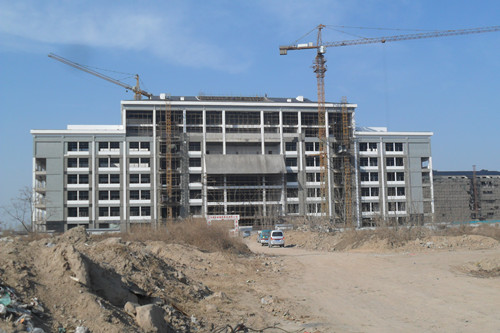 3.图书馆塑钢窗安装、打密封胶,防火卷帘安装,七八层地板砖粘贴,主楼南立面变更位置彩砂喷涂,汽车坡道内墙涂料,礼堂地坪施工,七八层南立面玻璃幕墙玻璃安装,天井钢结构安装焊接(见下图)