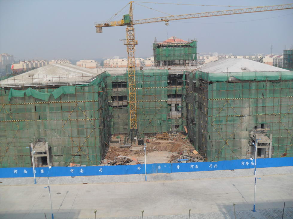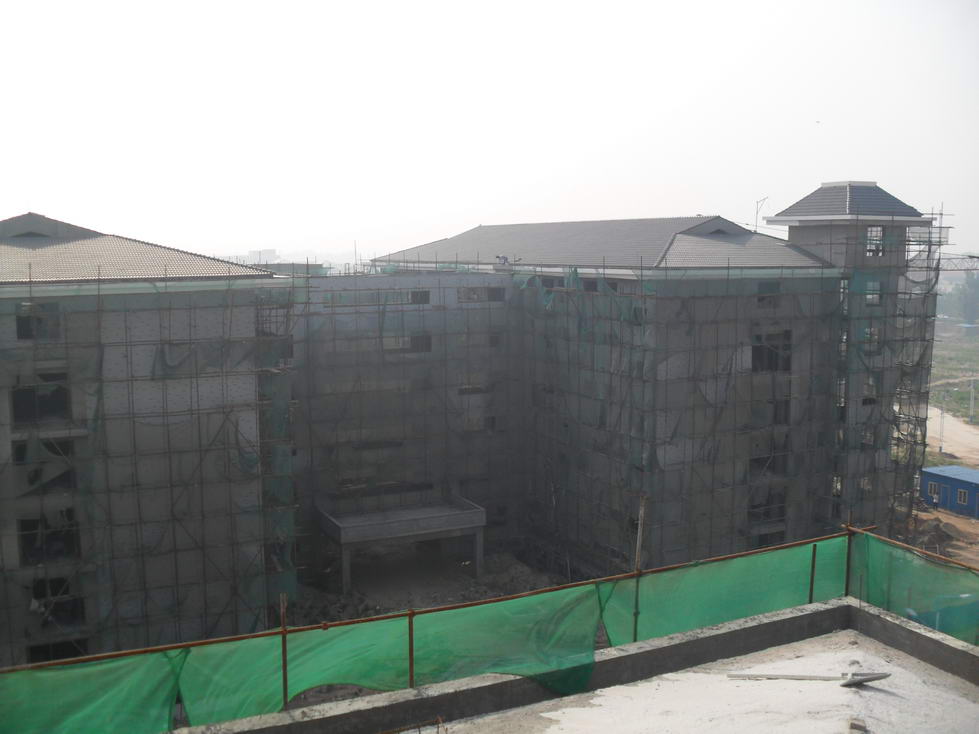 化工学院实训楼正在进行屋面找平,地基中段土方回填,1-3层砌墙,四层阁楼支模板、钢筋绑扎,外墙保温、防水等装饰材料正在选购中。