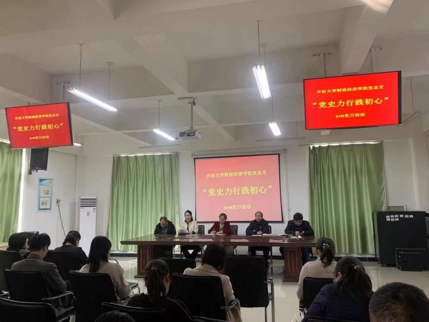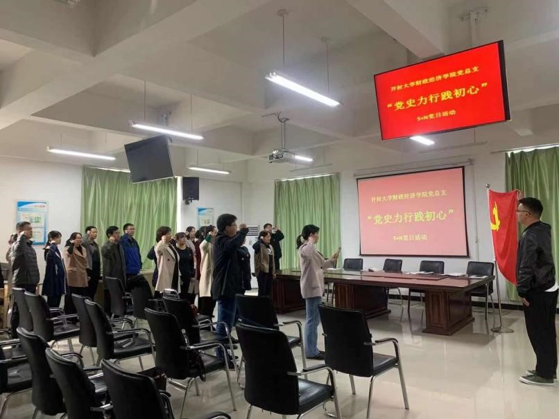 10月18日下午,财政经济学院党总支召开5+N主题教育活动。会前,全体党员重温入党誓词,在党旗下庄严宣誓。