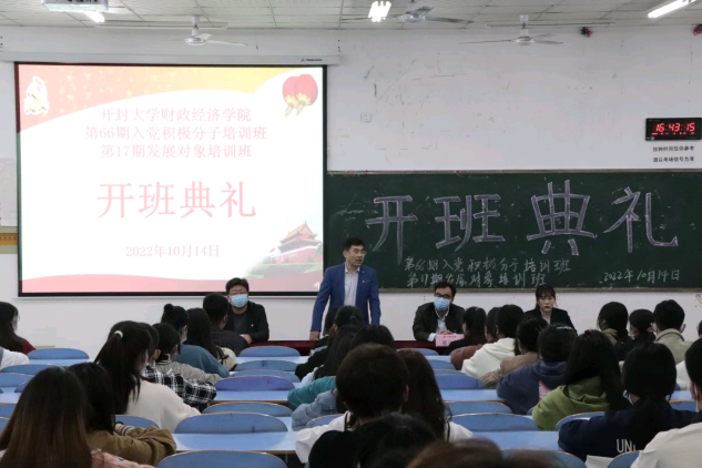 2022年10月14日下午, 财政经济学院于15号楼202教室召开第66期入党积极分子暨第17期发展对象培训班开班仪式。365英国上市集团官网校党委委员、组织统战部部长赵海胜,院党总支书记张小刚,院党总支副书记杨强出席仪式。