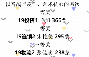 本次活动要求学生通过唱歌、朗诵、乐器表演、舞蹈表演、相声等具体形式展现疫情期间自己对科学防疫、日常生活、网课学习等主题的思考。上交的优秀作品中,学生们或化为灵动的仙子、或化为运动的健儿,用自己优雅的舞步和飘逸的身姿展现积极向上的精神风貌。其中,2019级投资1班毛旭用甜美的歌声表达自己的心情,2019连锁2班宋艳美通过录制短视频为武汉加油,彰显出财经学子的青春活力。征集环节结束后,学院团总支通过微信公众号对部分作品线上展览,按照作品内容、清晰程度等标准进行投票评选,经过层层筛选,毛旭荣获一等奖,宋艳美荣获二等奖,张佳欣荣获三等奖,范晨龙等三名同学荣获优秀奖。
