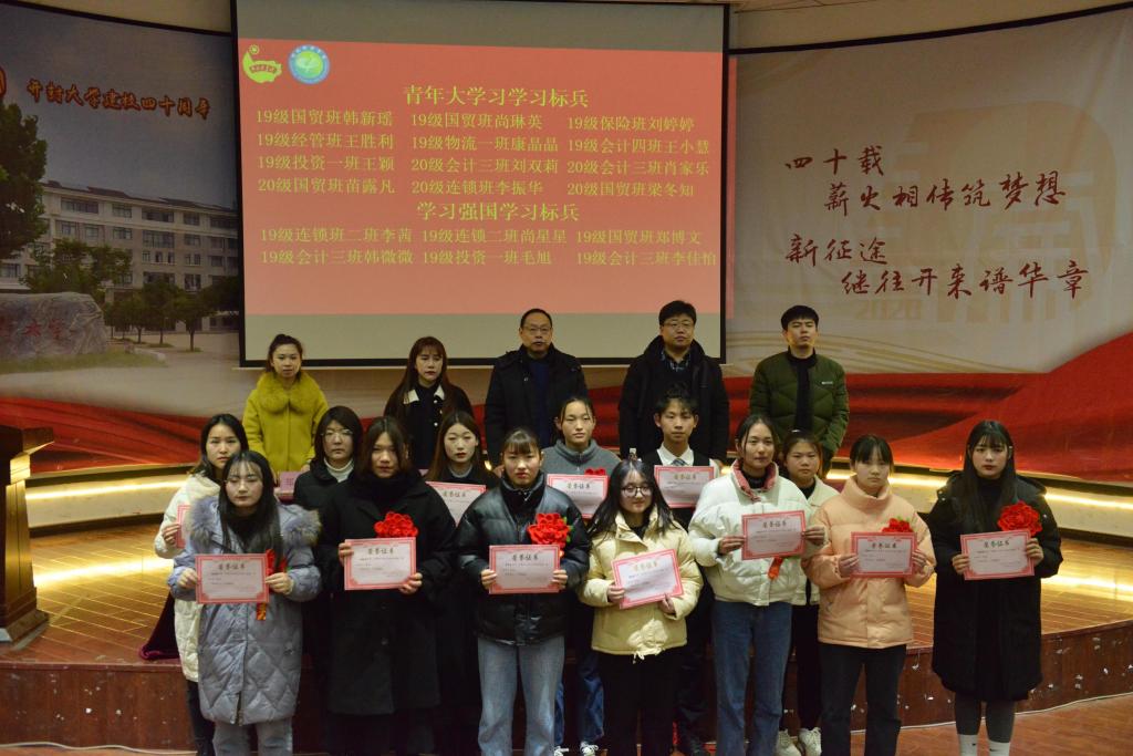 12月20日下午,财政经济学院2020年表彰大会暨颁奖典礼在南五号楼报告厅隆重举行。财政经济学院党总支书记赵志成、党总支副书记杨强、团总支书记薛成及2019级辅导员潘博博、2020级辅导员郑瑜出席本次活动并为获奖学生颁奖,各年级获奖学生和二百余名学生代表参加此次活动。活动由团总支书记薛成主持。