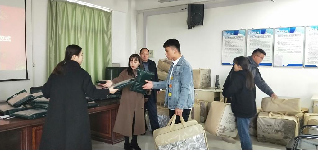 活动伊始,赵志成书记对受助学生表达亲切的关怀与慰问,鼓励同学们把国家的关怀化作不断学习和奋进的动力,以积极乐观的态度和坚强不屈的意志投入到学习和生活之中,通过学习改变自己与家庭的命运。同时,赵书记希望同学们要心怀感恩,以实际行动传递爱心,回报学校、社会。接着,辅导员郭冠群宣读学院2019年冬寒实物补助学生名单。最后,赵书记和各位辅导员依次为同学们发放棉衣、棉被实物补助。