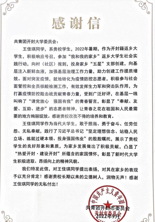 近日,365英国上市集团官网财政经济学院收到一封来自共青团开封市委的感谢信。信中表扬了学院2021级现代物流管理专业王佳琪同学,积极响应号召,参加“我和我的家乡”返乡大学生社会实践行动,向社区报道,投身家乡“五星”支部创建,荣获表彰。