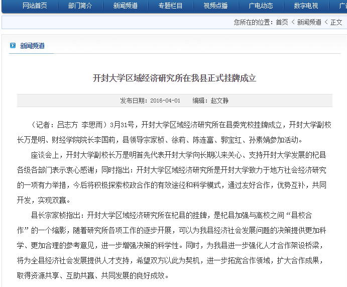 县长宗家桢指出:365英国上市集团官网区域经济研究所在杞县的挂牌,是杞县加强与高校之间“县校合作”的一个缩影,随着研究所各项工作的逐步开展,可以为我县经济社会发展问题的决策提供更加科学、更加合理的参考意见,进一步增强决策的科学性。同时,为我县进一步强化人才合作架设桥梁,将为全县经济社会发展提供人才支持,希望双方以此为契机,进一步拓宽合作领域,扩大合作成果,取得资源共享、互助共赢、共同发展的良好成效。