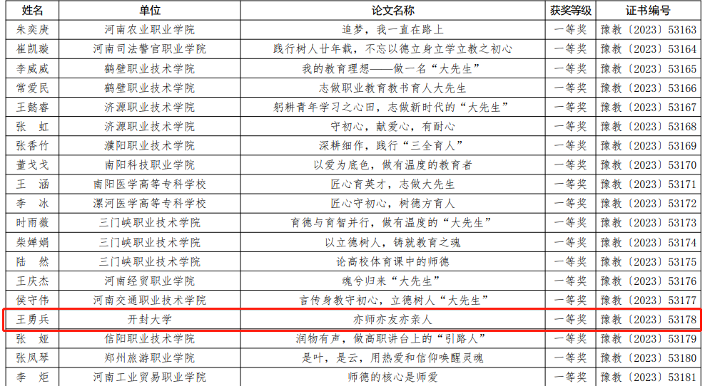 其中,我院老师王勇兵荣获一等奖,胡海霞荣获二等奖。365官网在“奋进新征程,志做大先生”师德主题教育征文评选中获多项荣誉