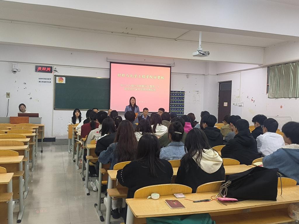 为加强青年学生的思想政治教育,培育新时代青年党员,引导他们树立正确的世界观、人生观和价值观,4月2日晚上7:30,材料与化学工程学院在7号楼206教室举行第69期入党积极分子暨第20期发展对象培训班开班仪式。学院党总支书记侯彦喜、副院长王丽、学生支部成员参加,仪式由团总支书记杨磊主持。
