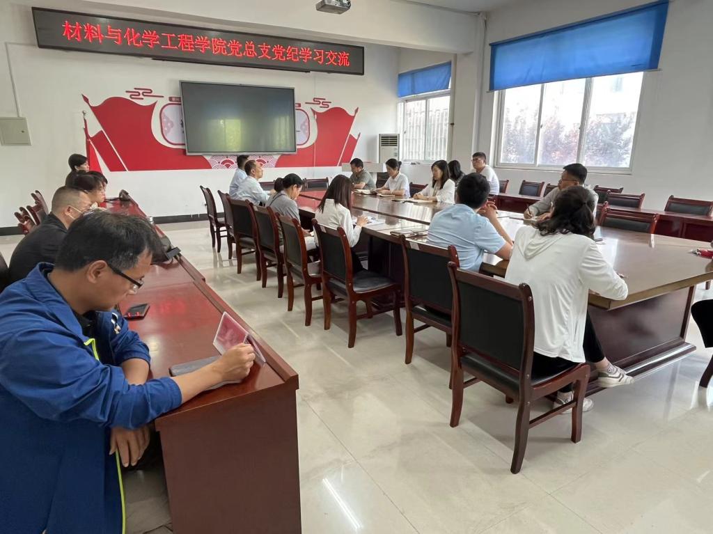 5月16日下午,材料与化学工程学院党纪学习教育读书班交流研讨会在7号楼201会议室举行,学院党总支纪检委员、院长韩艳霞主持会议,学院全体教师党员参加。