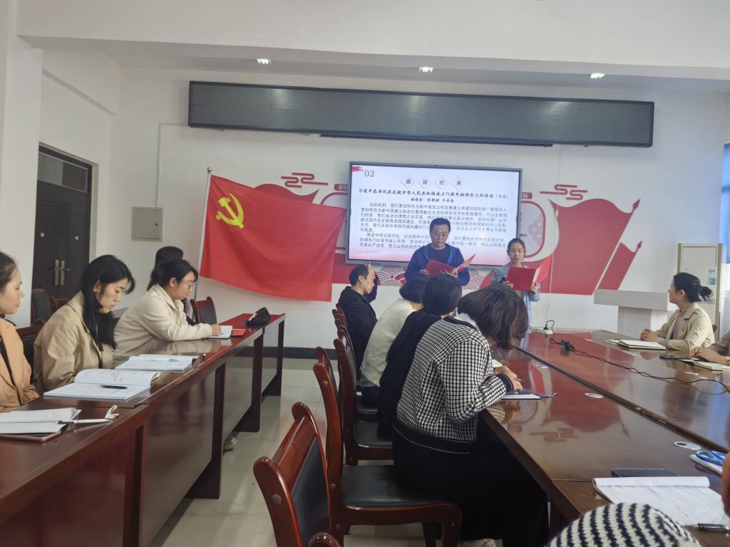 首先,教工支部书记王丽同志带领全体参会党员重温入党誓词;接着,平泽禹和张艳树两位同志诵读了《习近平总书记在庆祝中华人民共和国成立75周年招待会上的讲话》;随后,支部党员同志们足额上交党费。