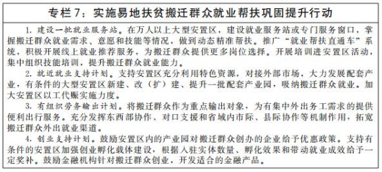稳定脱贫人口就业。健全脱贫人口、农村低收入人口就业帮扶长效机制,保持脱贫人口就业领域的扶持政策、资金支持、帮扶力量总体稳定。健全有组织劳务输出工作机制,将脱贫人口作为优先保障对象,稳定外出务工规模。支持脱贫地区大力发展当地优势特色产业,继续发挥就业帮扶车间、社区工厂、卫星工厂等就业载体作用,为脱贫人口创造就地就近就业机会。聚焦国家乡村振兴重点帮扶县、易地扶贫搬迁安置区,积极引进适合当地群众就业需求的劳动密集型、生态友好型企业(项目),增加本地就业岗位,组织专项就业服务活动实施集中帮扶。