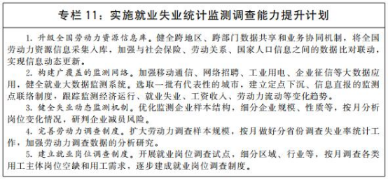完善就业失业统计监测调查体系。加快构建系统完备、立体化的就业失业监测网络,实现劳动力市场、企业用工主体和劳动者个体全覆盖,全面反映就业增长、失业水平、市场供求状况。完善就业统计指标体系和调查统计方法,探索进行就业质量、就业稳定性等方面的分析。推进大数据在就业统计监测领域的应用。
