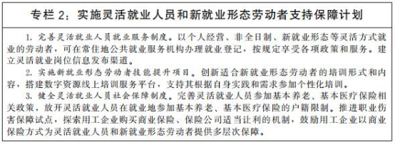 支持多渠道灵活就业和新就业形态发展。破除各种不合理限制,建立促进多渠道灵活就业机制,支持和规范发展新就业形态。鼓励传统行业跨界融合、业态创新,增加灵活就业和新就业形态就业机会。加快落实《关于维护新就业形态劳动者劳动保障权益的指导意见》,建立完善适应灵活就业和新就业形态的劳动权益保障制度,引导支持灵活就业人员和新就业形态劳动者参加社会保险,提高灵活就业人员和新就业形态劳动者社会保障水平。规范平台企业用工,明确平台企业劳动保护责任。健全职业分类动态调整机制,持续开发新职业,发布新职业标准。