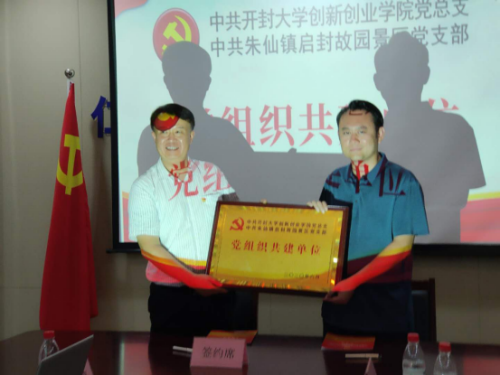 会后创新创业学院党总支书记孙进旭与朱仙镇启封故园景区党支部书记刘维辰共同签订《中共365英国上市集团官网创新创业学院党总支中共朱仙镇启封故园景区党支部“创先争优”共建协议》,协议签订结束后,与会人员参观了朱仙镇启封故园党员活动中心。