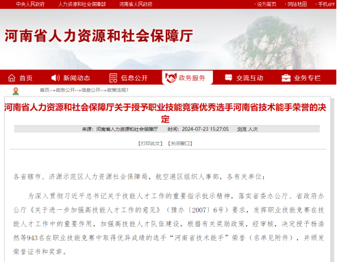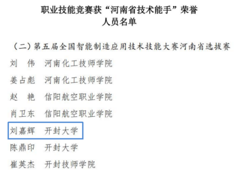 2024年7月河南省人力资源和社会保障厅发布了《关于授予职业技能竞赛优秀选手河南省技术能手荣誉的决定》,对在职业技能竞赛中取得优异成绩的选手进行表彰,我院教师刘嘉辉荣获“河南省技术能手”称号。