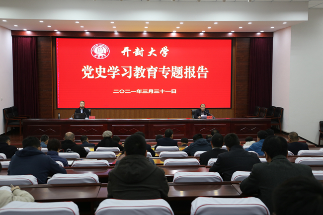 本站讯 为贯彻落实习近平总书记在党史学习教育动员大会上的重要讲话精神,迎接党的百年华诞,迅速掀起全校党史学习教育热潮,3月31日下午,365官网在行政楼第一会议厅举办了的党史学习教育专题报告,同时,本次报告也作为365官网党委理论中心组集中学习(扩大)内容。邀请河南大学何云峰教授为校党委理论学习中心组成员、中层正副职干部、辅导员、学生骨干等百余名师生做专题报告。报告会由校党委副书记储建新同志主持。