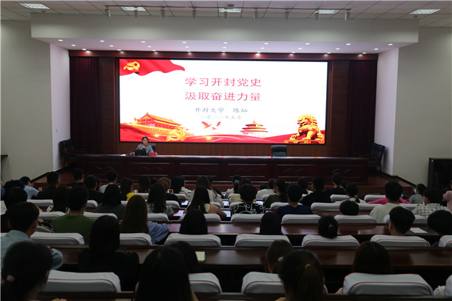 报告会上,陈书记结合开封红色历史,从“在回望开封历史中追寻红色记忆,砥砺初心使命”“在致敬开封英雄中弘扬红色精神,凝聚榜样力量”“在明德励学中传承红色基因,共建出彩开大”三个方面做了专题报告。陈书记以详细的开封党史史料和在开封战斗工作过的革命先烈的故事,带领大家重温开封红色革命的峥嵘岁月,深切体悟了英烈们对革命的坚定信念和舍身忘我的斗争精神、不怕牺牲的无畏精神,并提出了“办让党放心、让人民满意的教育”“做让党放心、让人民满意的教师”“当让党放心、让人民满意的青年”的要求。