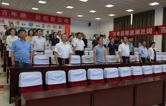 上午8时,师生着装整齐,佩戴党员徽章,怀着无比激动和自豪的心情收看庆祝大会。鲜艳的旗帜、庄严的场景、嘹亮的合唱、热烈的氛围,感染着每一位在场的师生。大家聚精会神、目不转睛地观看直播盛况,感怀中国共产党100年来的光辉历程和取得的历史性成就、发生的历史性变革。