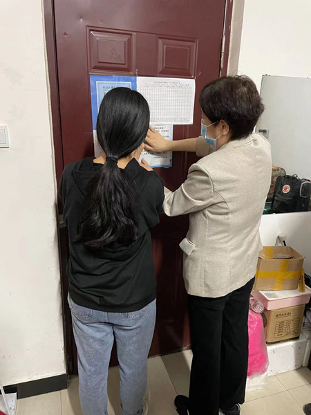 校工会主席成芳和学生共同张贴防疫小贴士、晨午晚检登记表以及校园封闭管理承诺书