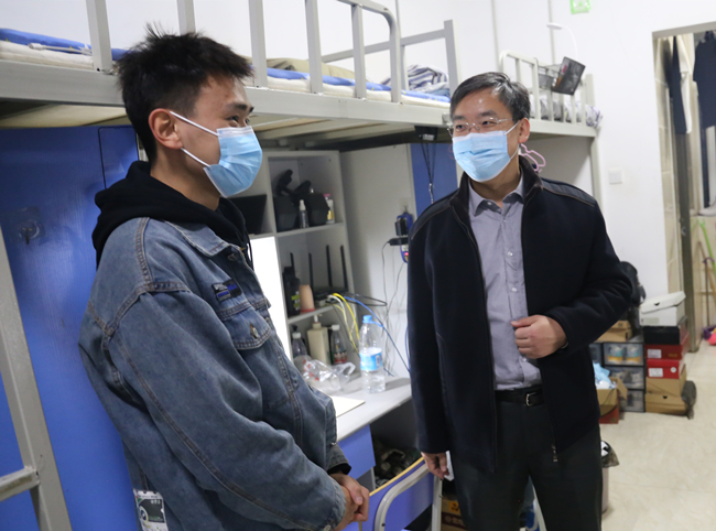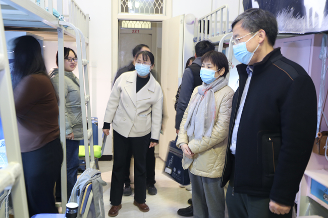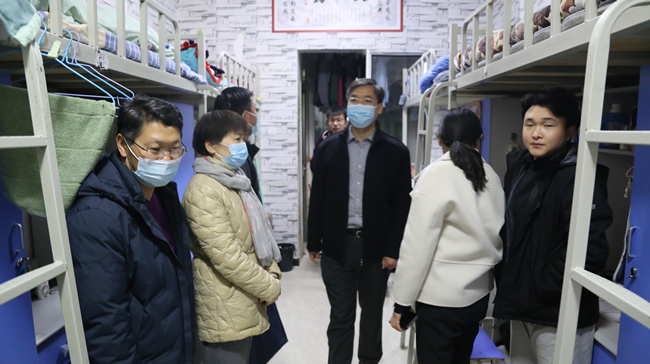 本站讯 为强化学生文明宿舍建设,加强各项宿舍管理措施的落实,12月1日晚,校长宋晓炜,校党委委员、工会主席成芳带领党委宣传部、学生工作部、后勤管理服务中心负责人深入宿舍看望学生,并开展文明安全检查。