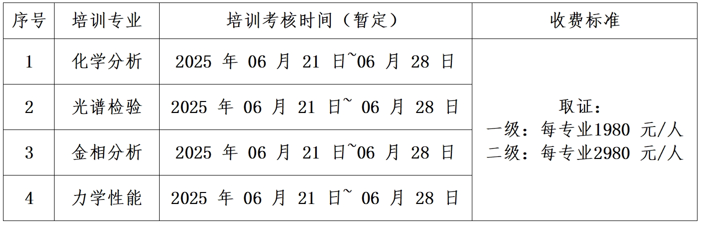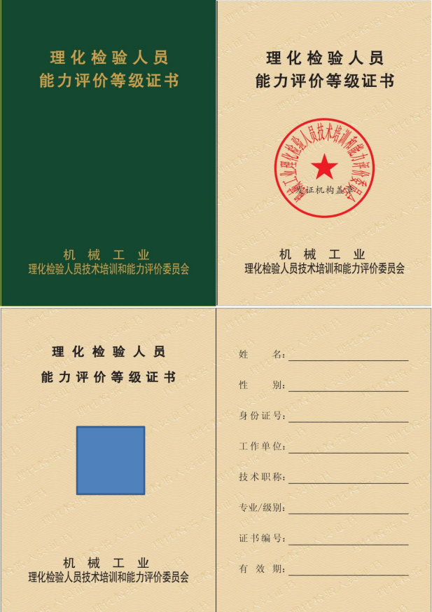 经中国机械工业联合会“机械理化人员能评委”批准,装备再制造培训办公室具备化学分析、光谱分析、力学性能、金相检验四个专业初、中级检验人员的技术培训和能力认定相关资质。学员经培训及考试合格后,经“机械理化人员能评委”评审颁发能力评价证书(见附件1),有效期四年,可在机经网(中国机械工业联合会官网)查询。