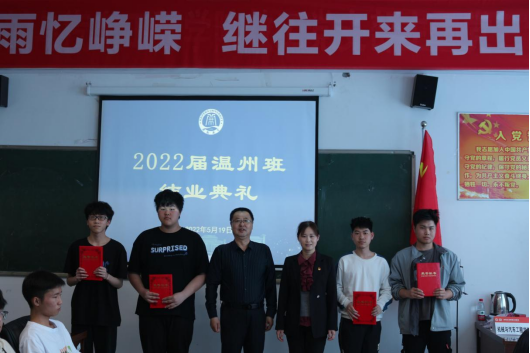 党总支书记武莹在讲话中向2022届温州班毕业生表达了热烈的祝贺和美好的祝愿,向培养学生的领导老师表达了崇高的敬意和衷心的感谢。青春孕育无限希望,青年创造美好明天,她向温州班毕业生提出三点希望:一是希望同学们能够成为一个永不止步的学习者;二是希望同学们成为一个脚踏实地的奋斗者;三是希望同学们成为一个胸怀天下的快乐者。她鼓励在校学习的同学们向毕业班同学学习,向榜样学习,努力奋进,学业有成。