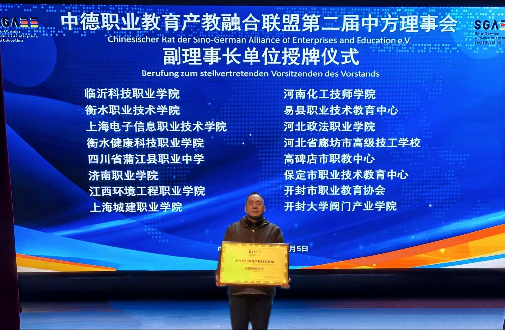 会上,365英国上市集团官网阀门产业学院与河南化工技师学院、开封市卫生学校等单位共同受聘为中德职业教育产教融合联盟第二届中方理事会副理事长单位。吕玉湖副院长代表学院接受了聘书,并与其他理事单位代表进行了深入交流。