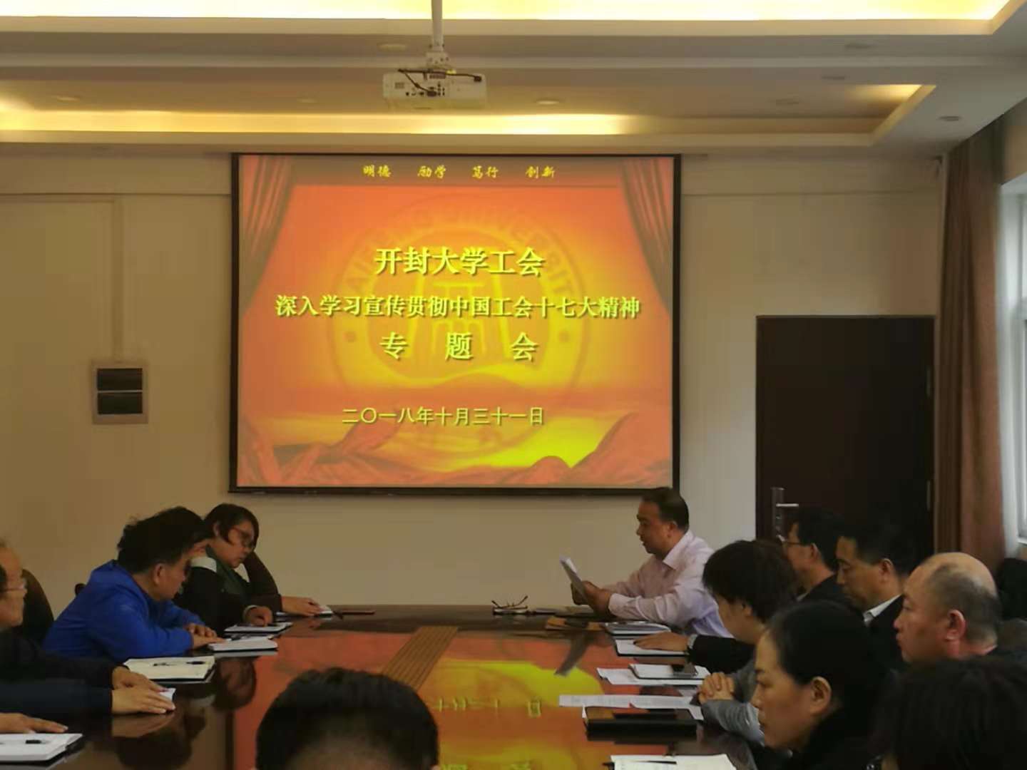 10月31日下午,365官网工会组织工会委员会委员、各分工会主席在行政楼二楼会议室集中学习中国工会十七大精神。校工会主席成芳出席会议。