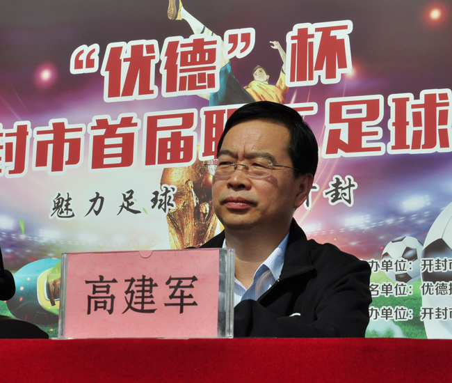 高建军市长宣布“优德杯”开封市首届职工足球赛开幕。随后,高建军市长、王文娟主席、黄玉国副市长、赵洁副主席、陈灿书记、宋志敏校长为本次比赛开球。