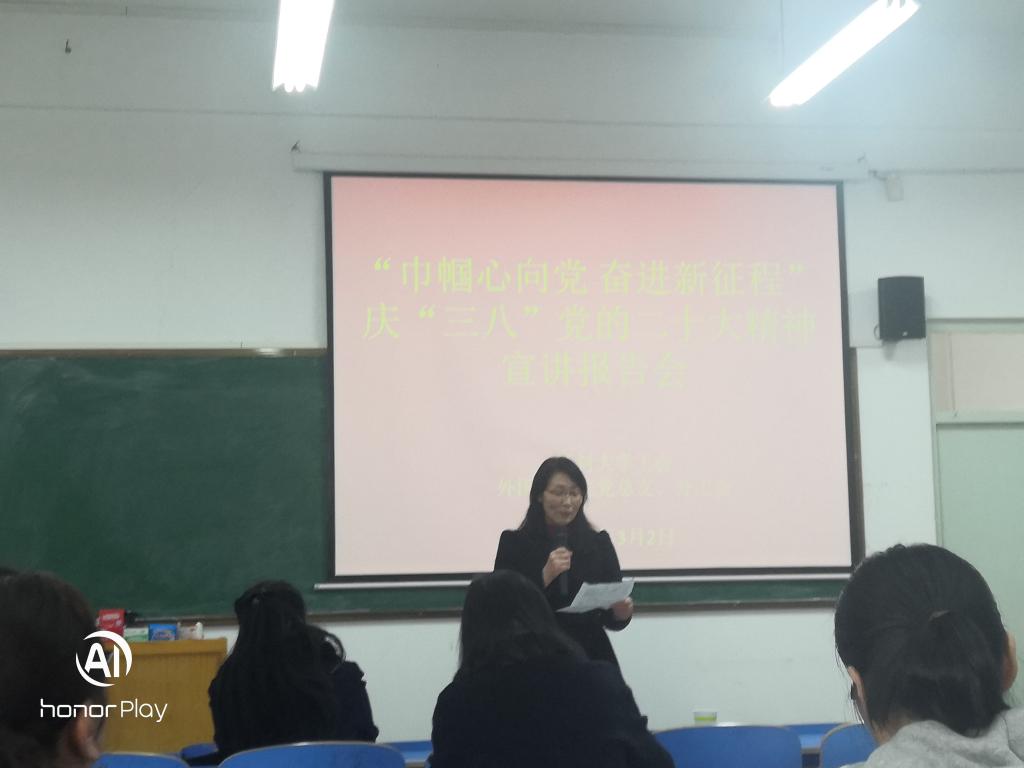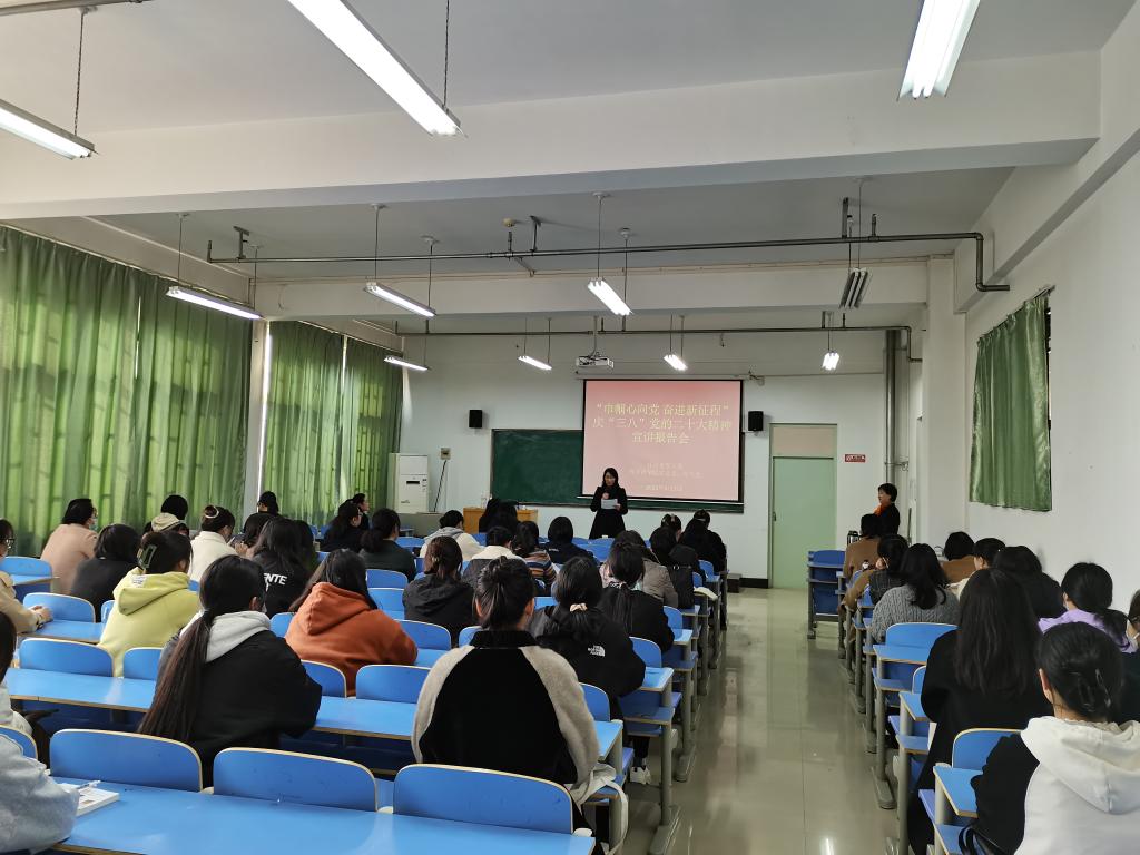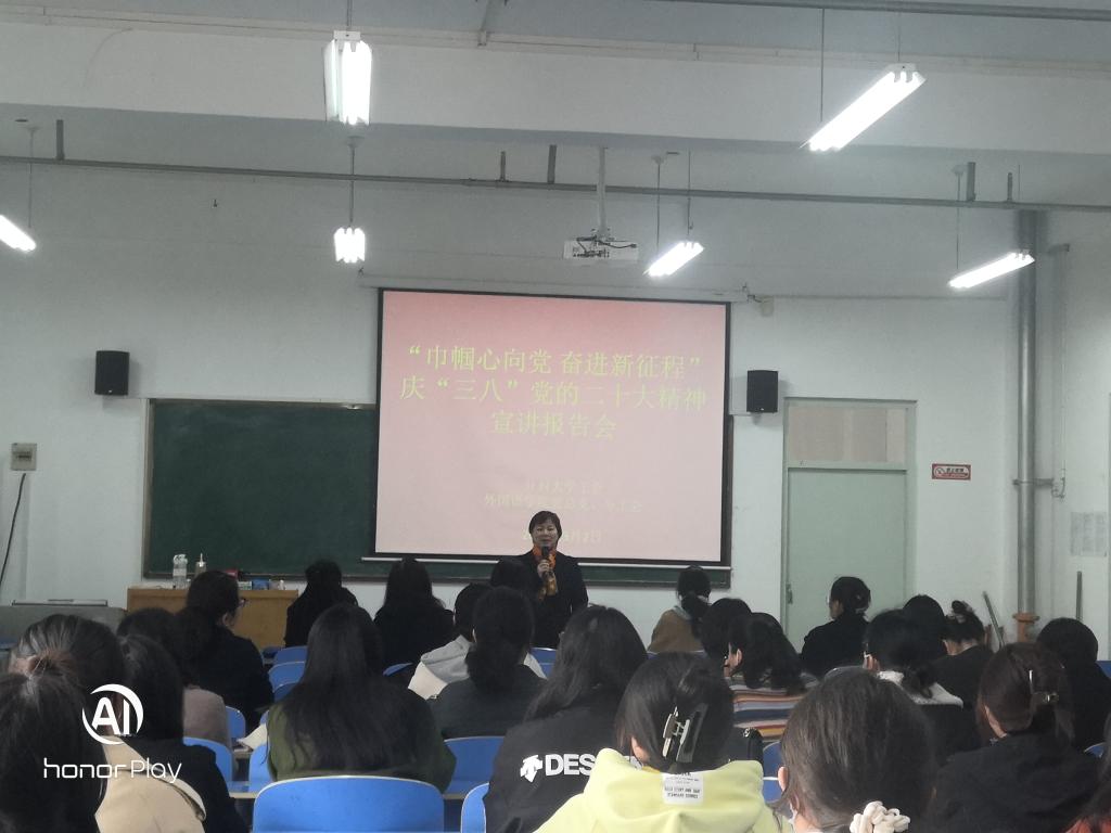 为了庆祝第113个三八国际妇女节,2023年 3月2日下午在17号楼303教室,学校工会与外国语学院党总支、分工会联合举办的“巾帼心向党 奋进新征程”庆“三八”党的二十大精神宣讲报告会,邀请开封市党的二十大精神宣讲团宣讲员、学校马克思主义学院教师苏会君副教授作专题报告。校工会副主席张红艳、外国语学院总支书记孟祥茹、院长程欣、校工会全体女教工、外国语学院分工会全体女教工及30名女生代表到场聆听,报告会由孟祥茹主持。