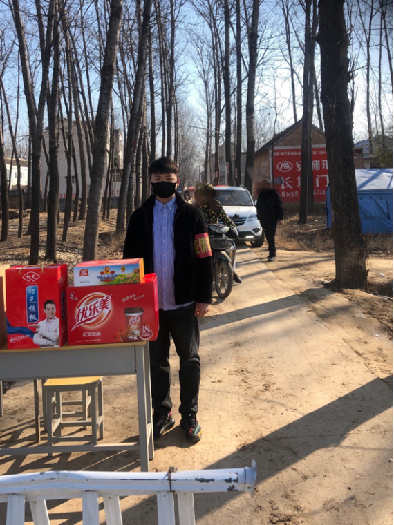 国际教育学院的2017电子商务班学生孙晨涛,自费买了牛奶与火腿肠等慰问品去周口市太康县马头镇小孙店防役防控点慰问工作人员并在现场做志愿工作,作为一名预备党员他尽自己的所能为奋斗在一线的基层工作人员贡献自己的绵薄之力!
