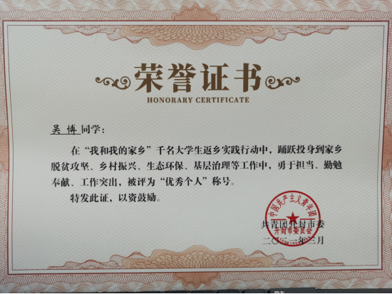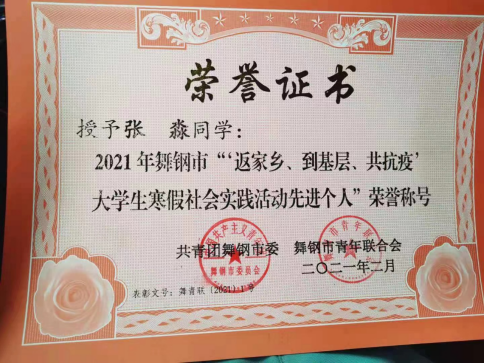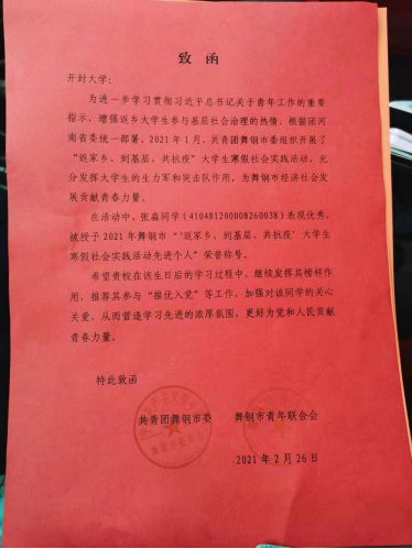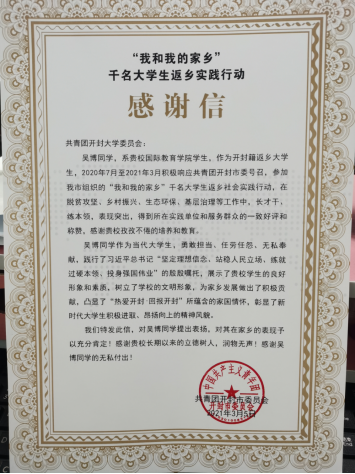 国际教育学院学生积极参与千名大学生返乡实践行动18会计班吴博同学荣获共青团开封市委“我和我的家乡”千名大学生返乡实践行动“优秀个人”称号18会计班张淼同学获共青团舞钢市委“返家乡、到基层、共抗疫”大学生寒假社会实践活动先进个人称号院争得了荣誉