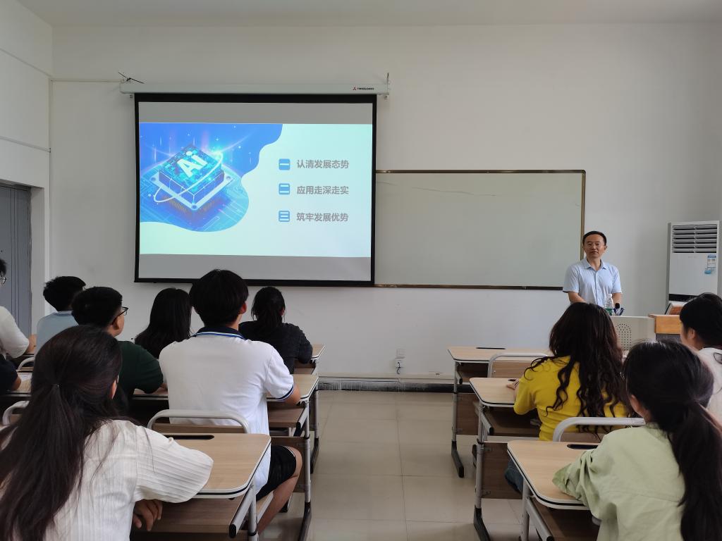为提升学生对人工智能发展趋势的认知水平和应用能力,6月15日下午,副校长李治深入国际教育学院(外国语学院),为2024级跨境电子商务专业学生带来《正确认识人工智能新浪潮》为主题的思政课。