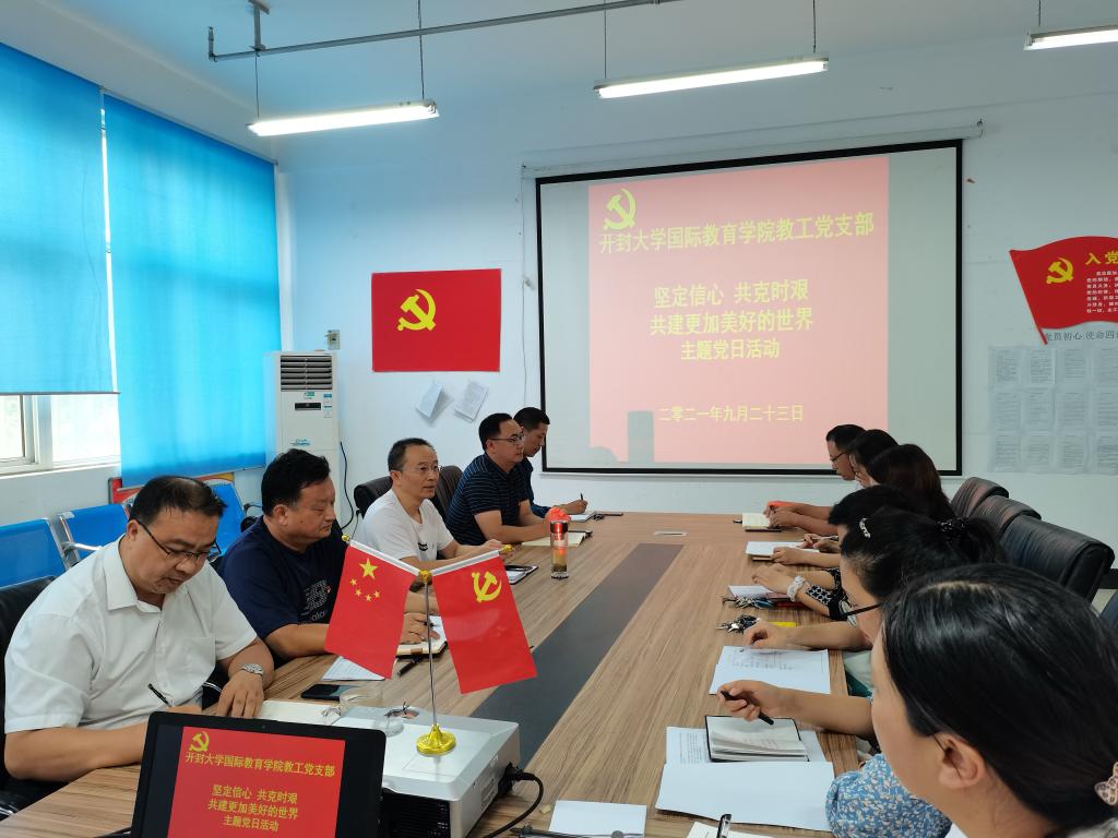 9月23日下午,国际教育学院教工党支部开展了“坚定信心 共克时艰、共建更加美好的世界”主题党日活动,校党委委员、副校长李治同志及教工党支部全体党员参加会议,会议由教工党支部书记蒋大山同志主持。